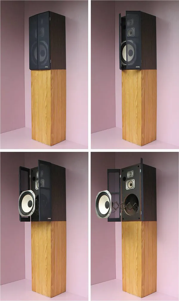 ‘This interesting project by French artist Stephane Vigny, is a combination of a cuckoo clock and a giant loud speaker. When the bass is loud, the largest speaker on the bottom is released on a hinge-mechanism and catapulted into the room, retreating back to the cabinet when the sound softens.’ — Make: